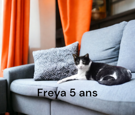 Freyja, 5 ans, est un peu peureuse mais si on va vers elle et qu'on a sa confiance, elle se laisse caresser et aime les câlins. Parfois elle lèche la main. Elle est aussi un peu joueuse. Elle est propre.