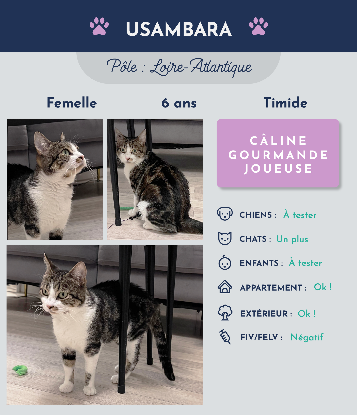 Bonjour, je m’appelle Usambara, une mignonne femelle de 6 ans ! Je suis un peu timide au début mais je m’adapte très vite. J’aime bien me reposer la journée et sortir de ma cachette le soir pour réclamer des câlins et manger