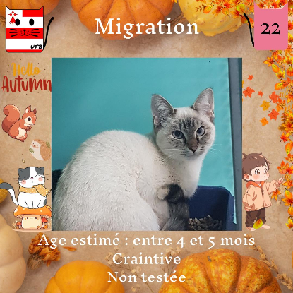 Migration, femelle de 4-5 mois craintive (un comportement normal en fourrière) qui vous attend dans une fourrière du 22. ATTENTION SORTIE AU PLUS TARD LE 30/09/2023 (avant euthanasie) !