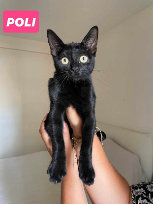 Petite femelle noire de 3 mois au pelage tout doux. Calme, curieuse et joueuse, Poli est une gourmande un peu timide mais qui se laisse facilement approcher pour des gros câlins !