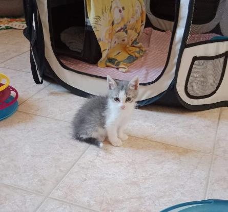 "Silver est né début août d'une chatte errante. Sa maman s'est faite écraser et ses 4 chatons, âgés de 3 semaines, se sont retrouvés orphelins dans un jardin. Maintenant installé en famille d'accueil avec sa fratrie, Silver apprécie le confort. C'est un chaton joueur, câlin et assez calme.