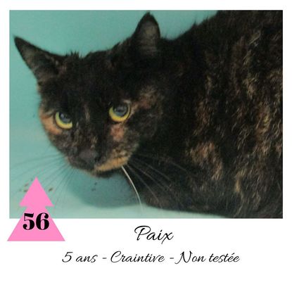 URGENCE EUTHANASIE ! Paix est une minette de 5 ans craintive (en situation de fourrière) qui vous attend dans une fourrière du 56. ATTENTION SORTIE AU PLUS TARD LE 19/12/2019 (avant euthanasie) ! Pour adopter, c'est facile : ➡️ On se rend sur la page facebook d'Urgence Fourrière de Bretagne (UFB) -> https://www.facebook.com/sosfourrieresbreizh/ ➡️ On vient en message privé sur la page UFB ➡️ On remplit le questionnaire ➡️ Si le questionnaire est validé, on se rend disponible pour la pré-visite ➡️ On se rend aussi disponible pour venir chercher le loulou en fourrière Les chats sortent de fourrière primo-vaccinés et identifiés. Restera à charge de l’adoptant le rappel de vaccin et la stérilisation qui est OBLIGATOIRE. Les femelles en fourrière ayant été trouvées dans la rue, il y a fort à parier que nombre d'entre elles en âge de l'être soient gestantes ... ---- A PROPOS D'URGENCE FOURRIERE DE BRETAGNE (UFB) Nous sommes un COLLECTIF d'ASSOCIATIONS DE PROTECTION ANIMALE (qui rassemble notamment Moustaches et Compagnie, Bêtes de Scène, les Pachas, Chats Libres de Berné, etc, etc....) Le BUT de ce collectif d'associations est donc de SORTIR ces animaux des fourrières surchargées en les faisant ADOPTER de manière LEGALE par des familles ou en leur trouvant des FAMILLES D'ACCUEIL lorsque des places en association se libèrent.