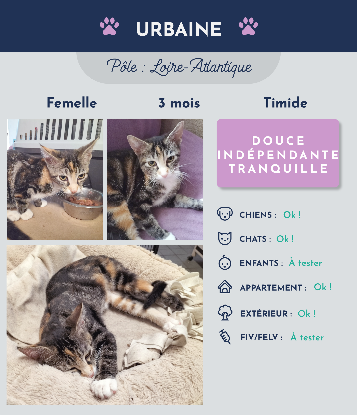 Salut ! Moi c’est Urbaine, une chatonne de 3 mois. Je suis un peu peureuse de prime abord : je ne me laisse pas porter ou approcher aisément, sauf lorsque l'heure du repas ou de la sieste sonne. Cependant, ne vous méprenez pas, je suis une experte en ronronnements, et une fois que je me sens en confiance, je vous gratifierai de ces doux sons apaisants ! J'aime explorer et gambader à ma guise, j'apprécie mon indépendance pour jouer et m'épanouir. Avant d’arriver dans ma famille d’accueil, j’étais en appartement avec de nombreux chats où j’ai été sauvée peu après la chute de ma sœur du 9ème étage. Cette expérience m'a laissé avec une petite appréhension de la hauteur, alors je préfère rester en sécurité à l'intérieur (et ça tombe bien, comme j’ai les oreilles blanches je n’aurais pas pu sortir de toute façon !).