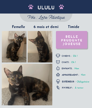 Coucou, moi c’est Ululu, la belle femelle de 6 mois et demi au pelage écaille de tortue. J’ai fait de gros progrès depuis que je suis chez ma famille d’accueil, même si le travail n’est pas fini. L’humain me fait encore assez peur, mais moins qu’avant où je pouvais à peine croiser votre regard. Maintenant je viens vous sentir la main avec une pointe de curiosité, mais je reste encore méfiante. J’adore la compagnie de mes congénères, ce n’est pas dérangeant si je ne suis pas le seul chat de la maison, mais être seule pourrait aussi m’aider à progresser plus rapidement. Avec moi, il faudra prendre le temps, j’ai encore du travail à faire. En s’armant d’un peu de patience, je suis sûre qu’on pourra y arriver.