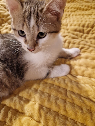 Choupie est la sœur de Choupinou. Elle est très câline et ronronne volontiers, mais elle est un peu plus timide que son frère. Elle est très attachée à Choupinou et imite tout ce qu'il fait. L'idéal serait qu'ils soient adoptés ensemble