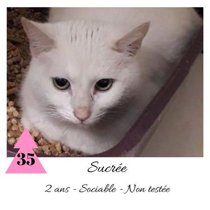 URGENCE EUTHANASIE ! Sucrée est une minette de 2 ans sociable qui vous attend dans une fourrière du 35. ATTENTION SORTIE AU PLUS TARD LE 26/12/2019 (avant euthanasie) ! Pour adopter, c'est facile : ➡️ On se rend sur la page facebook d'Urgence Fourrière de Bretagne (UFB) -> https://www.facebook.com/sosfourrieresbreizh/ ➡️ On vient en message privé sur la page UFB ➡️ On remplit le questionnaire ➡️ Si le questionnaire est validé, on se rend disponible pour la pré-visite ➡️ On se rend aussi disponible pour venir chercher le loulou en fourrière Les chats sortent de fourrière primo-vaccinés et identifiés. Restera à charge de l’adoptant le rappel de vaccin et la stérilisation qui est OBLIGATOIRE. Les femelles en fourrière ayant été trouvées dans la rue, il y a fort à parier que nombre d'entre elles en âge de l'être soient gestantes ... ---- A PROPOS D'URGENCE FOURRIERE DE BRETAGNE (UFB) Nous sommes un COLLECTIF d'ASSOCIATIONS DE PROTECTION ANIMALE (qui rassemble notamment Moustaches et Compagnie, Bêtes de Scène, les Pachas, Chats Libres de Berné, etc, etc....) Le BUT de ce collectif d'associations est donc de SORTIR ces animaux des fourrières surchargées en les faisant ADOPTER de manière LEGALE par des familles ou en leur trouvant des FAMILLES D'ACCUEIL lorsque des places en association se libèrent.