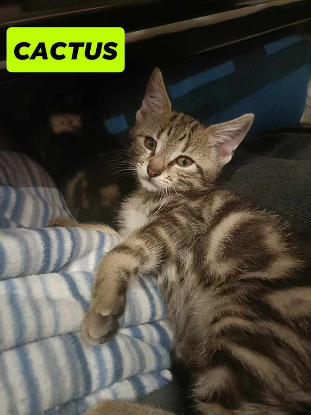 Mâle tigré très joueur et espiègle. Il est curieux et grimpe partout pour découvrir son environnement. Avec sa petite tête de renard, il adore faire la bagarre avec ses frères et soeurs. Il est gourmand et n'aime pas trop partager son repas.