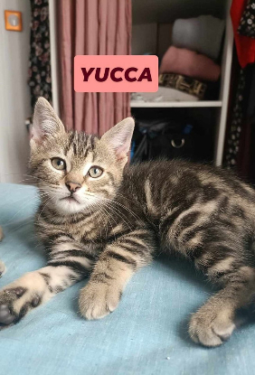 Femelle tigrée comme sa maman, elle est très câline et a un regard à croquer. Elle vient même parfois chercher à frotter sa tête contre celle de son humain. Elle est joueuse, surtout avec ses frères et sa soeur.