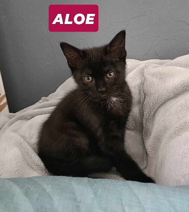 Femelle noire qui présente une jolie tâche blanche au poitrail et des yeux dorés. Très joueuse, elle dort souvent de son côté mais apprécie fortement les câlins et se met immédiatement à ronronner.