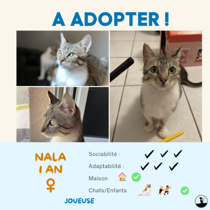 Nala est une toute jeune minette d’un an, vive et ultra sociable La louloute croque la vie à pleine dent, elle est joueuse, curieuse et toujours prête pour des gourmandises ! Nala c’est l’histoire d’une jeune maman, certainement abandonnée, qui goute enfin au bonheur de vivre avec des humains. Elle recherche donc beaucoup de tendresse, d’amour et de bienveillance. Elle adore se faire dorloter, mais aussi qu’on joue avec elle