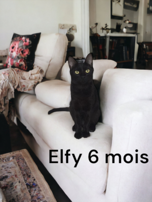 lfy est une minette noir de 8 mois, elle assez indépendante, elle aura besoin de patience pour être apprivoisée. Elle est propre.
