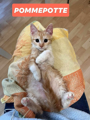Chatonne de 2 mois et demi. Rigolote avec ses grands yeux de chouette et son air effarouché, Pommepotte est une minette curieuse et aventureuse qui cherche le contact avec l’humain. Elle ronronne aux caresses, à la pâtée, et adore les jeux.