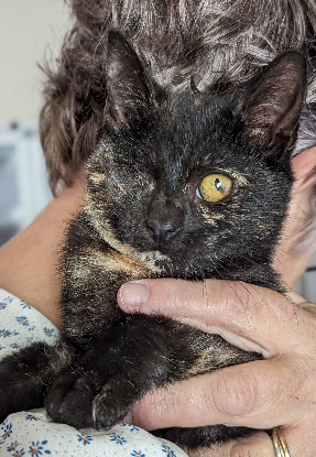 Elle est arrivée au refuge avec un œil trop abimé pour être sauvé. Nous avons profité de cette opération pour la faire stériliser.