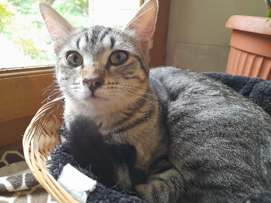 Je suis UMBRELLA une petite chatonne tigrée grise avec de beaux yeux jaunes qui a déjà vécu quelques aventures.