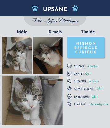 Coucou, moi c'est Upsane ! Je suis un petit chaton très mignon. Je suis espiègle, j'adore me cacher et sauter sur les pieds, puis partir en courant ! Je suis curieux mais un peu craintif quand même… néanmoins, je suis très facile à vivre ![]()