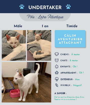 Bonjour chère famille, Je m’appelle Undertaker et je suis un jeune chat de 1 an.. Actuellement hébergé chez une famille d’accueil, j’ai pour espoir de retrouver une famille dans les plus brefs délais. Parfois un peu timide, je suis propre et câlin, je n’ai pas peur d’aller voir les personnes proches de moi et suis calme avec les enfants. La cohabitation avec un autre chat ou chien est encore à tester. Je cherche parfois à vouloir sortir car je suis assez aventurier mais je ne vais jamais très loin et suis facile à appeler et à attraper : la vie en appartement m’est tout à fait possible bien que je préférerais s’il y avait un petit jardin ou un balcon. A très vite, Undertaker