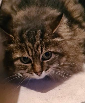 Chat femelle, type Européen, coloris tigrée à poils mi longs. Née le 1er avril 2021.