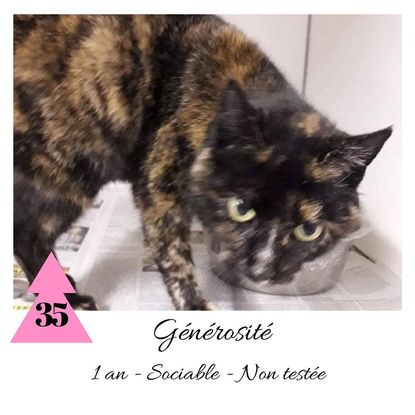 URGENCE EUTHANASIE ! Générosité est une minette de 1 an sociable qui vous attend dans une fourrière du 35. ATTENTION SORTIE AU PLUS TARD LE 03/01/2020 (avant euthanasie) ! Pour adopter, c'est facile : ➡️ On se rend sur la page facebook d'Urgence Fourrière de Bretagne (UFB) -> https://www.facebook.com/sosfourrieresbreizh/ ➡️ On vient en message privé sur la page UFB ➡️ On remplit le questionnaire ➡️ Si le questionnaire est validé, on se rend disponible pour la pré-visite ➡️ On se rend aussi disponible pour venir chercher le loulou en fourrière Les chats sortent de fourrière primo-vaccinés et identifiés. Restera à charge de l’adoptant le rappel de vaccin et la stérilisation qui est OBLIGATOIRE. Les femelles en fourrière ayant été trouvées dans la rue, il y a fort à parier que nombre d'entre elles en âge de l'être soient gestantes ... ---- A PROPOS D'URGENCE FOURRIERE DE BRETAGNE (UFB) Nous sommes un COLLECTIF d'ASSOCIATIONS DE PROTECTION ANIMALE (qui rassemble notamment Moustaches et Compagnie, Bêtes de Scène, les Pachas, Chats Libres de Berné, etc, etc....) Le BUT de ce collectif d'associations est donc de SORTIR ces animaux des fourrières surchargées en les faisant ADOPTER de manière LEGALE par des familles ou en leur trouvant des FAMILLES D'ACCUEIL lorsque des places en association se libèrent.