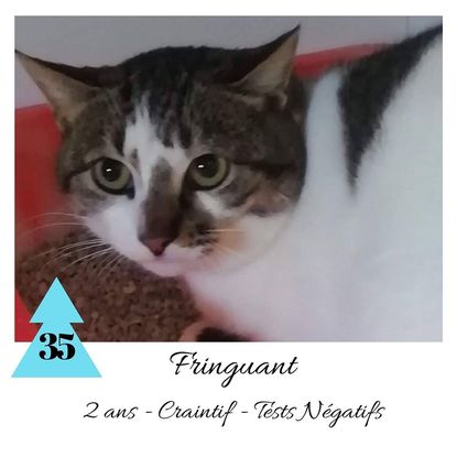 URGENCE EUTHANASIE ! Fringuant est un matou de 2 ans craintif (en situation de fourrière) qui vous attend dans une fourrière du 35. ATTENTION SORTIE AU PLUS TARD LE 03/01/2020 (avant euthanasie) ! Pour adopter, c'est facile : ➡️ On se rend sur la page facebook d'Urgence Fourrière de Bretagne (UFB) -> https://www.facebook.com/sosfourrieresbreizh/ ➡️ On vient en message privé sur la page UFB ➡️ On remplit le questionnaire ➡️ Si le questionnaire est validé, on se rend disponible pour la pré-visite ➡️ On se rend aussi disponible pour venir chercher le loulou en fourrière Les chats sortent de fourrière primo-vaccinés et identifiés. Restera à charge de l’adoptant le rappel de vaccin et la stérilisation qui est OBLIGATOIRE. Les femelles en fourrière ayant été trouvées dans la rue, il y a fort à parier que nombre d'entre elles en âge de l'être soient gestantes ... ---- A PROPOS D'URGENCE FOURRIERE DE BRETAGNE (UFB) Nous sommes un COLLECTIF d'ASSOCIATIONS DE PROTECTION ANIMALE (qui rassemble notamment Moustaches et Compagnie, Bêtes de Scène, les Pachas, Chats Libres de Berné, etc, etc....) Le BUT de ce collectif d'associations est donc de SORTIR ces animaux des fourrières surchargées en les faisant ADOPTER de manière LEGALE par des familles ou en leur trouvant des FAMILLES D'ACCUEIL lorsque des places en association se libèrent.