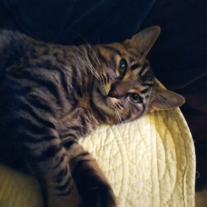 Très joueur, coquin et curieux de tout! Il est gourmand et adore ronronner. Il reste sensible aux gestes et bruits brusques mais c'est très furtif lorsqu'il se sent en confiance.