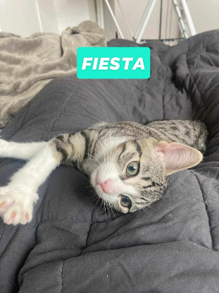 Fiesta est une vraie petite boule d’énergie ! Une fois qu’il se sent chez lui il sort de sa cachette et se montre joueur, mais toujours sans les griffes et câlin.