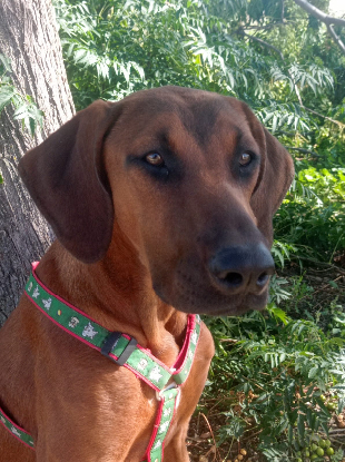 Elle serait de race pure chien rouge de Bavière mais de gabarit plus grand. C'est une super louloute, très câline, qui aime jouer et qui s'entend très bien avec ses congénères.