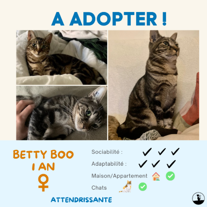 Pour Betty Boo nous cherchons une famille en appartement ou maison, un balcon est un petit plus, mais pas forcément nécessaire pour elle qui est très heureuse en intérieur. Betty Boo n’est pas compatible avec les enfants, elle aura besoin d’un environnement calme et routinier pour être heureuse. Dans son quotidien, Betty Boo aura besoin de la présence d’un autre compagnon chat.