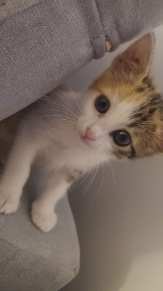 Kitty est un chaton fille de 3 mois, très joueuse et câline. Elle a été sauvée debut septembre alors qu'elle s'était réfugiée dans un moteur de voiture. Elle est en famille d'accueil chez la personne qui l'a trouvée