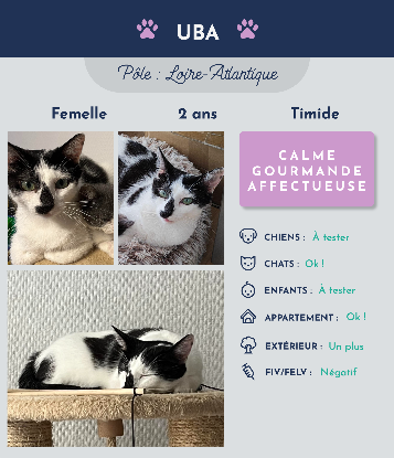 Bonjour, moi c’est Uba. Je suis une femelle de 2 ans, plutôt câline mais je reste sur mes gardes. J’aime me cacher sous les lits ou sur une chaise, là où l’on ne le voit pas. La sieste est pour moi le meilleur moment de la journée. Je suis aussi très gourmande, j’adore les croquettes et raffole de la pâté. Je suis très attirée par le monde extérieur et j’adorais pouvoir me dégourdir les pattes et découvrir ce nouveau monde. J’ai hâte de faire votre connaissance !