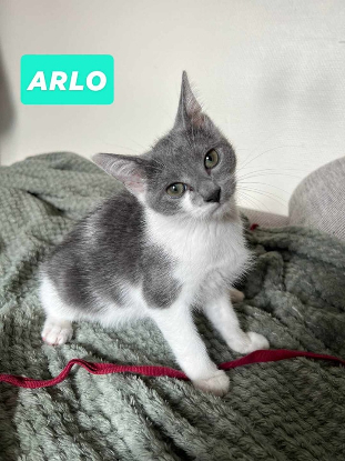 Arlo est un beau chaton aux couleurs gris et blanc. Il est très joueur et peut passer des heures à chasser la souris, en peluche bien sûr, car il vit en appartement depuis sa naissance.