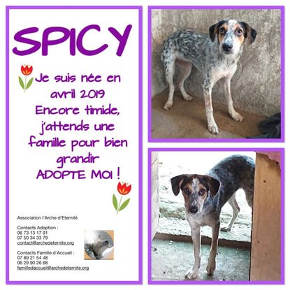 Spicy est née en Mars 2019. Elle se trouve actuellement en refuge. C'est une petite chienne gentille et timide, elle aura besoin d'une famille douce et patiente.