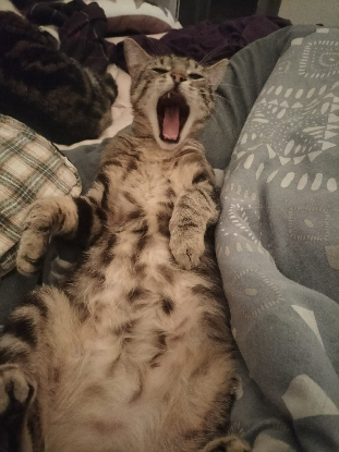 "Ziggy est vraiment un chat adorable et drôle ! Il adore prendre les jouets dans son bec, tout fier de lui, comme s'il venait de chasser une proie et vient nous la déposer à nos pieds en miaulant l'air de dire 'tu joues avec moi ?' ? Et il a une façon incroyable de faire des câlins ... lorsqu'on le prend dans les bras, il a l'air de fondre d'amour tellement il apprécie cela !"