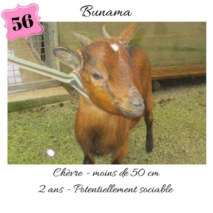 URGENCE EUTHANASIE ! Bunama est une chèvre de 2 ans sociable qui vous attend dans une fourrière du 56. ATTENTION SORTIE AU PLUS TARD LE 17/01/2020 (avant euthanasie) ! Pour adopter, c'est facile : ➡️ On se rend sur la page facebook d'Urgence Fourrière de Bretagne (UFB) -> https://www.facebook.com/sosfourrieresbreizh/ ➡️ On vient en message privé sur la page UFB ➡️ On remplit le questionnaire ➡️ Si le questionnaire est validé, on se rend disponible pour la pré-visite ➡️ On se rend aussi disponible pour venir chercher l'animal en fourrière. ---- A PROPOS D'URGENCE FOURRIERE DE BRETAGNE (UFB) Nous sommes un COLLECTIF d'ASSOCIATIONS DE PROTECTION ANIMALE (qui rassemble notamment Moustaches et Compagnie, Bêtes de Scène, les Pachas, Chats Libres de Berné, etc, etc....) Le BUT de ce collectif d'associations est donc de SORTIR ces animaux des fourrières surchargées en les faisant ADOPTER de manière LEGALE par des familles ou en leur trouvant des FAMILLES D'ACCUEIL lorsque des places en association se libèrent.