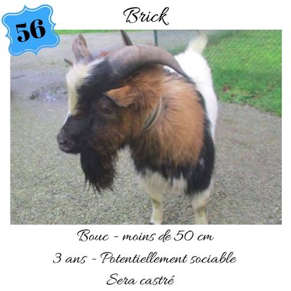 URGENCE EUTHANASIE ! Brick est un bouc de 3 ans sociable qui vous attend dans une fourrière du 56. ATTENTION SORTIE AU PLUS TARD LE 17/01/2020 (avant euthanasie) ! Pour adopter, c'est facile : ➡️ On se rend sur la page facebook d'Urgence Fourrière de Bretagne (UFB) -> https://www.facebook.com/sosfourrieresbreizh/ ➡️ On vient en message privé sur la page UFB ➡️ On remplit le questionnaire ➡️ Si le questionnaire est validé, on se rend disponible pour la pré-visite ➡️ On se rend aussi disponible pour venir chercher l'animal en fourrière. ---- A PROPOS D'URGENCE FOURRIERE DE BRETAGNE (UFB) Nous sommes un COLLECTIF d'ASSOCIATIONS DE PROTECTION ANIMALE (qui rassemble notamment Moustaches et Compagnie, Bêtes de Scène, les Pachas, Chats Libres de Berné, etc, etc....) Le BUT de ce collectif d'associations est donc de SORTIR ces animaux des fourrières surchargées en les faisant ADOPTER de manière LEGALE par des familles ou en leur trouvant des FAMILLES D'ACCUEIL lorsque des places en association se libèrent.