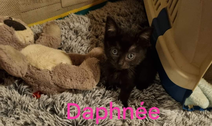 Salut je suis Daphnée, petite chatonne noire, toute calme ,toute douce, mais qu'est ce que j' aime jouer et arpenter la maison avec mon frère et ma soeur . Disponible à la réservation pour l instant ,je serai bientôt adoptable. 0651415869 pour plus de renseignements. Visible sur vallon pont d arc.