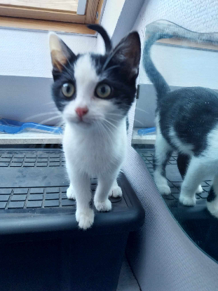 RAYMOND est un joli et adorable chaton noir et blanc, frère de Uguette