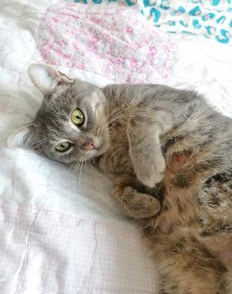 Une gentille chatte qui s'est très bien acclimatée à la vie de famille (à croire qu'elle connaissait déjà). Pas de crainte avec les humains même si elle ne les connaît pas.