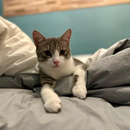 J’adore regarder par la fenêtre, dormir aux pieds de mes humains et les suivre partout. J’aime les câlins mais lorsque je l’ai décidé. Je ne suis pas craintif mais j’aurais besoin d’une famille patiente pour me laisser le temps de m’ouvrir complètement.
