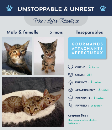 Hello, je suis Unstoppable, un petit mâle de 3 mois et voilà ma sœur, Unrest. Nous sommes tous les 2 très proches, c’est pourquoi on aimerait rester ensemble dans notre future famille. Moi, Unrest, je suis sociable et je ronronne facilement. Moi, Unstoppable, je suis plus timide même si maintenant, je dors régulièrement contre mon humain d'accueil. J'accepte volontiers d'être pris dans les bras, mais pas trop longtemps. Je mange des croquettes, mais j'ai un faible pour la pâtée. Je peux être très convaincant pour en obtenir ![]()