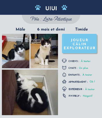 Coucou moi c'est Uiui ! Je suis un jeune chat très mignon et attachant. Je n'ai pas connu l'humain avant ma famille d'accueil, donc je suis encore assez timide… mais j'ai déjà fait de gros progrès ! J'aime de plus en plus les grosses caresses. Une fois ma confiance accordée, je ronronne énormément et je me roule sur le dos. Je commence à être de plus en plus à l'aise, même si les mouvements brusques ou les cris me font encore un peu peur. Il faudra donc être patients avec moi, mais une fois cette barrière passée je serai un chat plein de tendresse ! Je suis aussi curieux et je joue beaucoup, notamment avec mes 2 sœurs. Ce serait idéal pour moi d'avoir un copain avec qui m'amuser. J'aime aussi explorer chaque recoin de l'appartement. J'espère vite trouver une famille patiente et aimante. À bientôt !