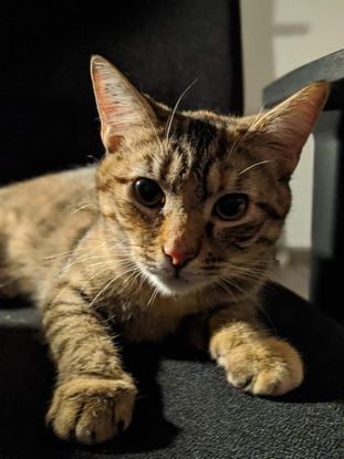 Perla femelle de 9 mois. Elle est vive et intelligente, surprenante à retenir certaines actions niveau jeu, douce en pelage et caractère. Elle est très câline, gourmande et super curieuse Elle joue beaucoup avec ses souris et le ruban ? Elle adore grimper ?‍♀️ Elle reconnaît son nom et vient quand on l’appelle.
