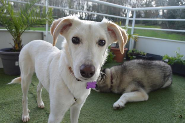Elle s'entend bien avec le chien de sa famille d'accueil.Elle n'est pour le moment pas très rassurée en extérieur.
