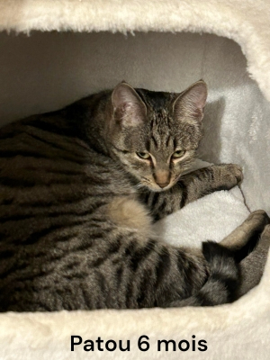 Patou, 6 mois, est un jeune minou un peu timide au départ mais qui devient rapidement très affectueux et câlin. Il se laisse porter aux bras. Il est gourmand et très joueur.