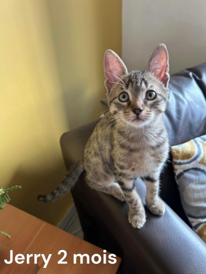 Jerry, 2 mois, est un adorable chaton, très sociable, câlin et très joueur. Il aura besoin de présence humaine ou féline.
