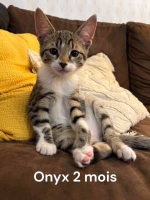 Onyx, 2 mois, est un chaton très mignon, très affectueux et très joueur. Il aura besoin de présence humaine ou féline.