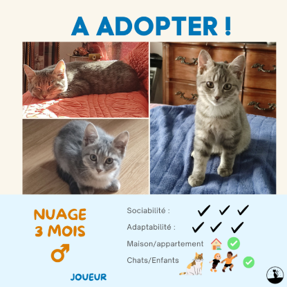 Nuage est un condensé de douceur et d’amour, un petit nuage quoi ! Ce chaton est très craquant, câlin et ronronneur à souhait