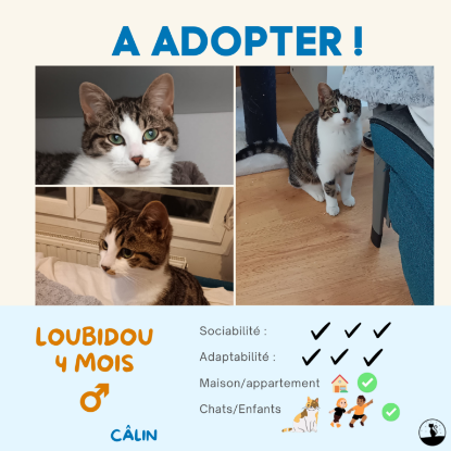 Pour Loubidou nous cherchons une famille très présente. Loubidou est très adaptable, il est compatible avec les enfants et avec ses congénères chats. Enfin, Loubidou réclamera beaucoup d’attention, il ne pourra pas rester seul tous les jours au risque d’être trop triste.