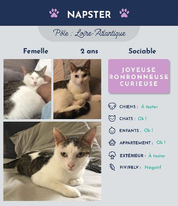 Miaou à vous qui venez de cliquer sur mon annonce ! Moi, c’est Napster, une petite boule de poils de 2 ans… Oui, je suis une jeune demoiselle si vous vous posez la question, et je suis un deux en un, je vous explique… J’ai un gros côté boule d’amour, vous découvrirez une ronronneuse professionnelle, une crème ; j’adore faire des câlins quand vous êtes dans le canapé pour des séances de patounage et dormir avec vous ! Sinon, ma famille d’accueil et ma coloc chat disent que je suis une minette plutôt joyeuse, gourmande et curieuse… un vrai bonheur à quatre pattes ! Sinon, j’aime bien me prélasser dans un hamac pour regarder dehors. Le plus ? Je m’entends bien avec mes congénères. Bref ! Je vous attends pour une rencontre et, si le coup de coeur est réciproque, pour écrire notre belle histoire à nous. Miaou ! Et à bientôt. Napster