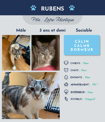 Coucou, Je m’appelle Rubens et je suis un mâle âgé de 3 ans et demi. J'apprécie d'avoir ma petite cabane sous des couvertures pour m’y sentir tranquille. Je suis très discret cependant j’apprécie toujours vos caresses ! Je suis très beau et propre! J’ai du mal à vivre avec d’autres animaux car je suis très timide, cependant je peux vivre avec des enfants ! Je préfère vivre en appartement.