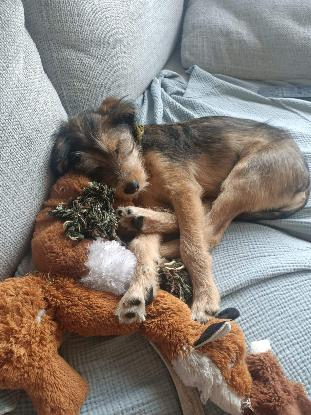C’est JUNIOR, un croisé griffon de 3 mois et demi, qui pèse 5 kg pour l’instant et devrait en peser entre 15 et 20 à l’âge adulte